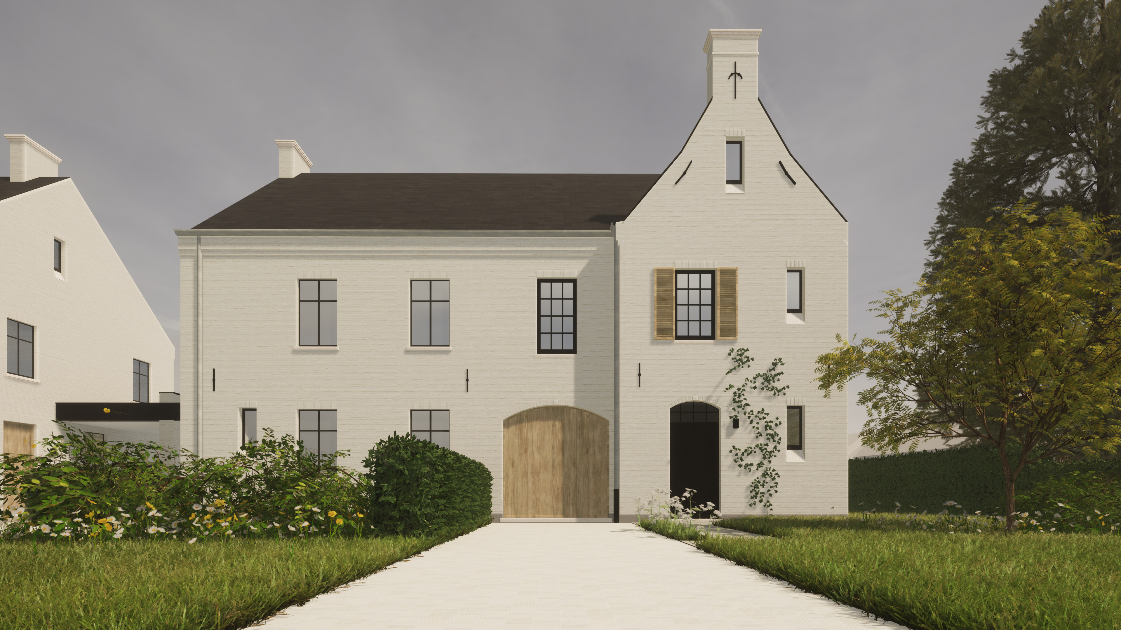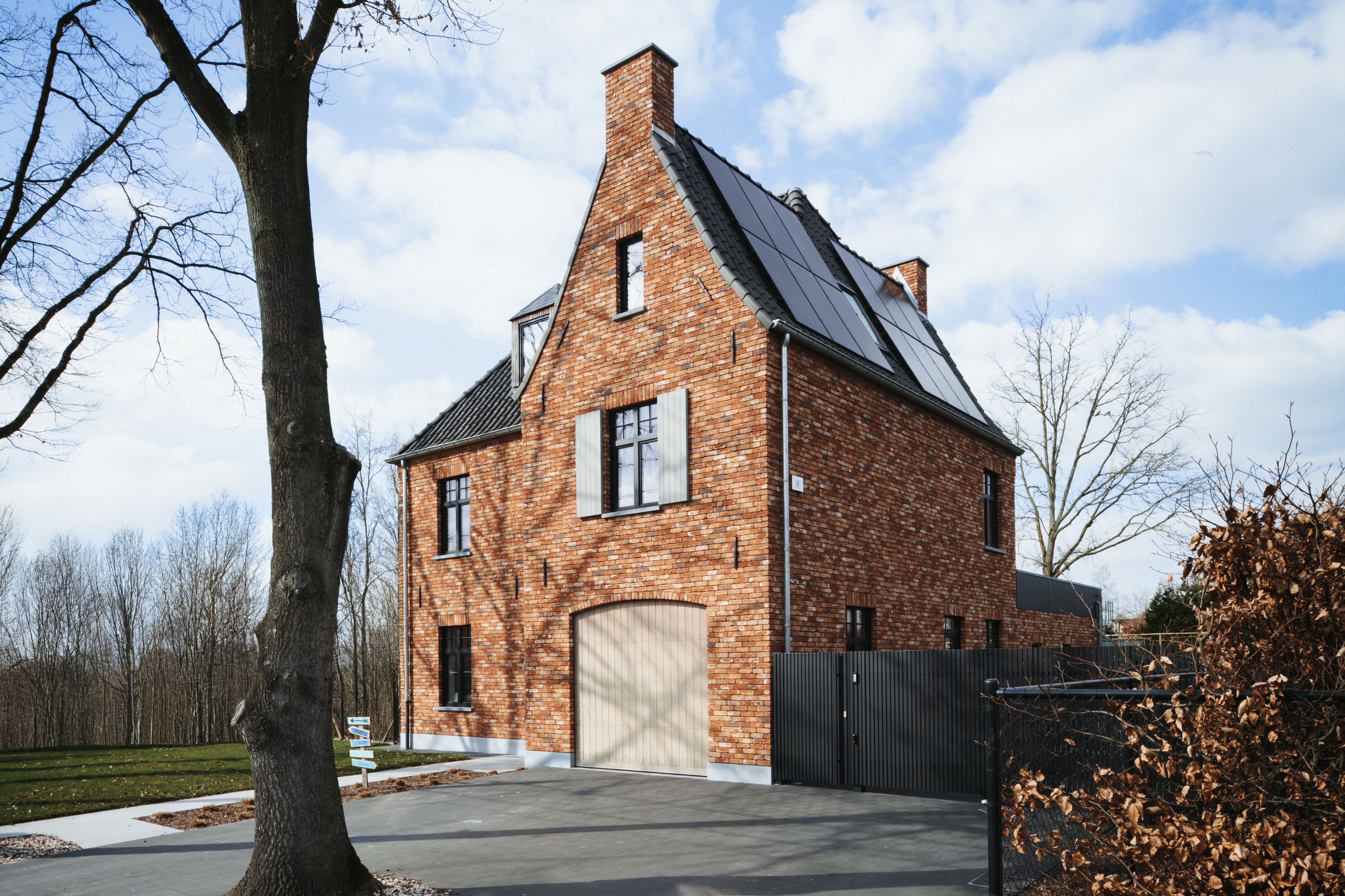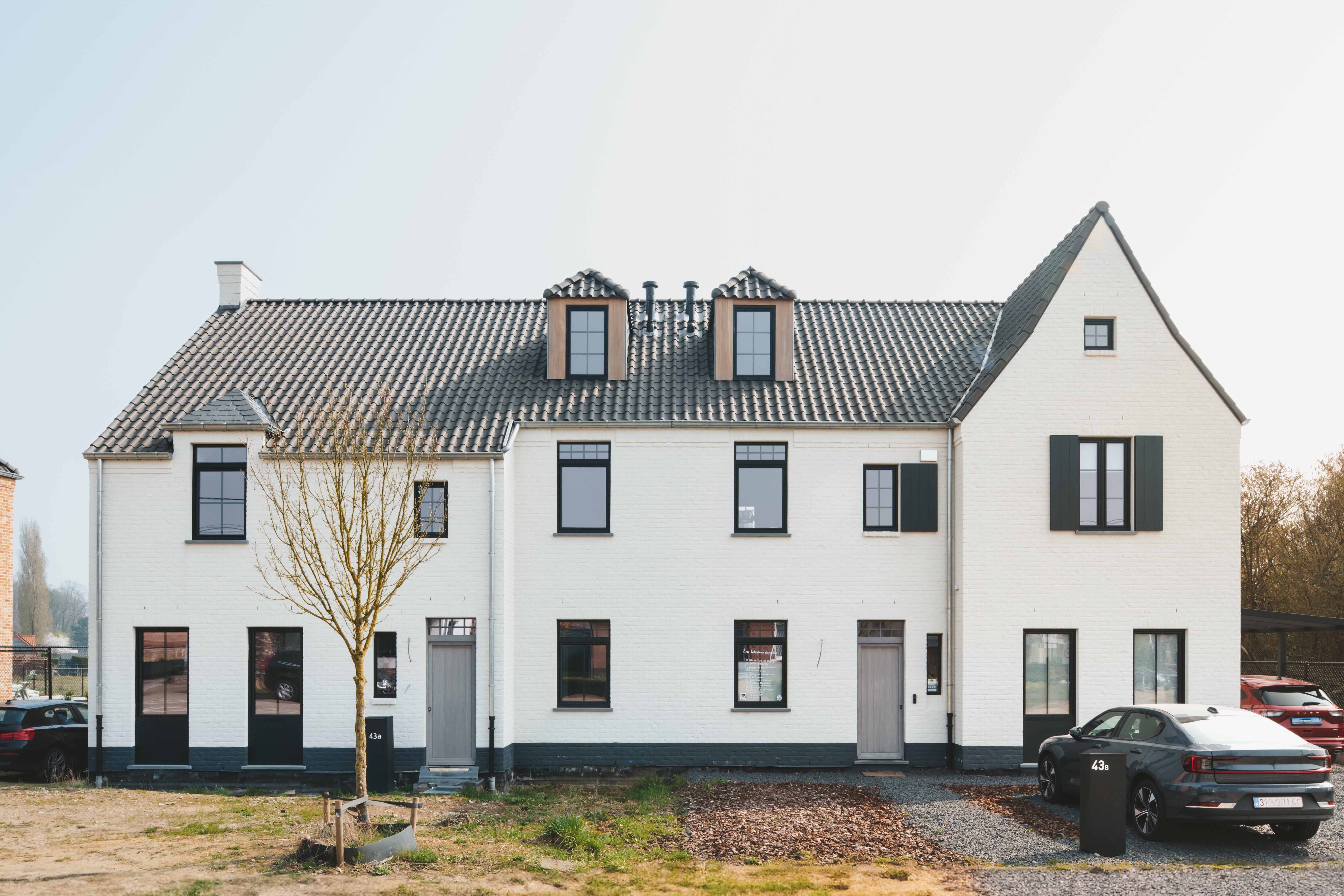 Vier woningen in manoirstijl met een moderne touch. Zwart buitenschrijnwerk, grote raampartijen en dakkapellen geven elke woning luxe en karakter.