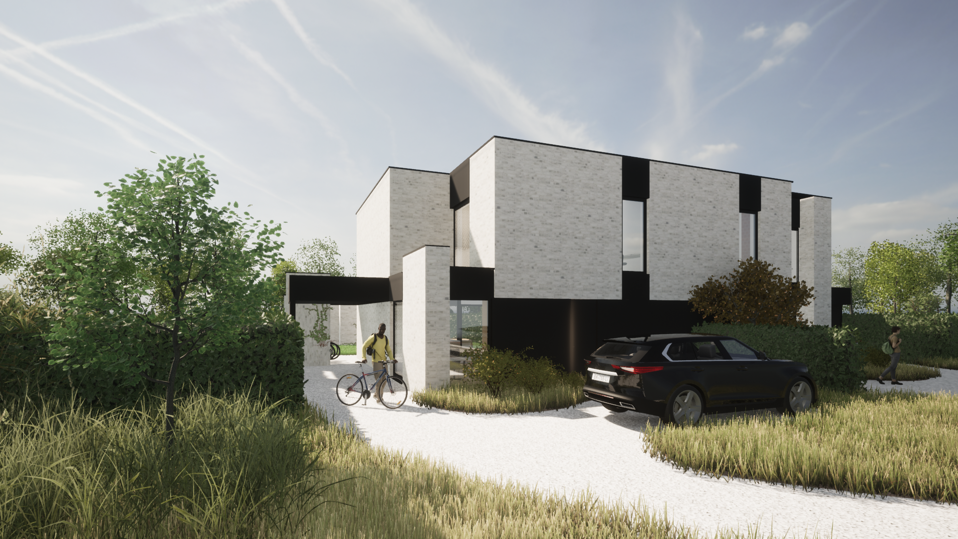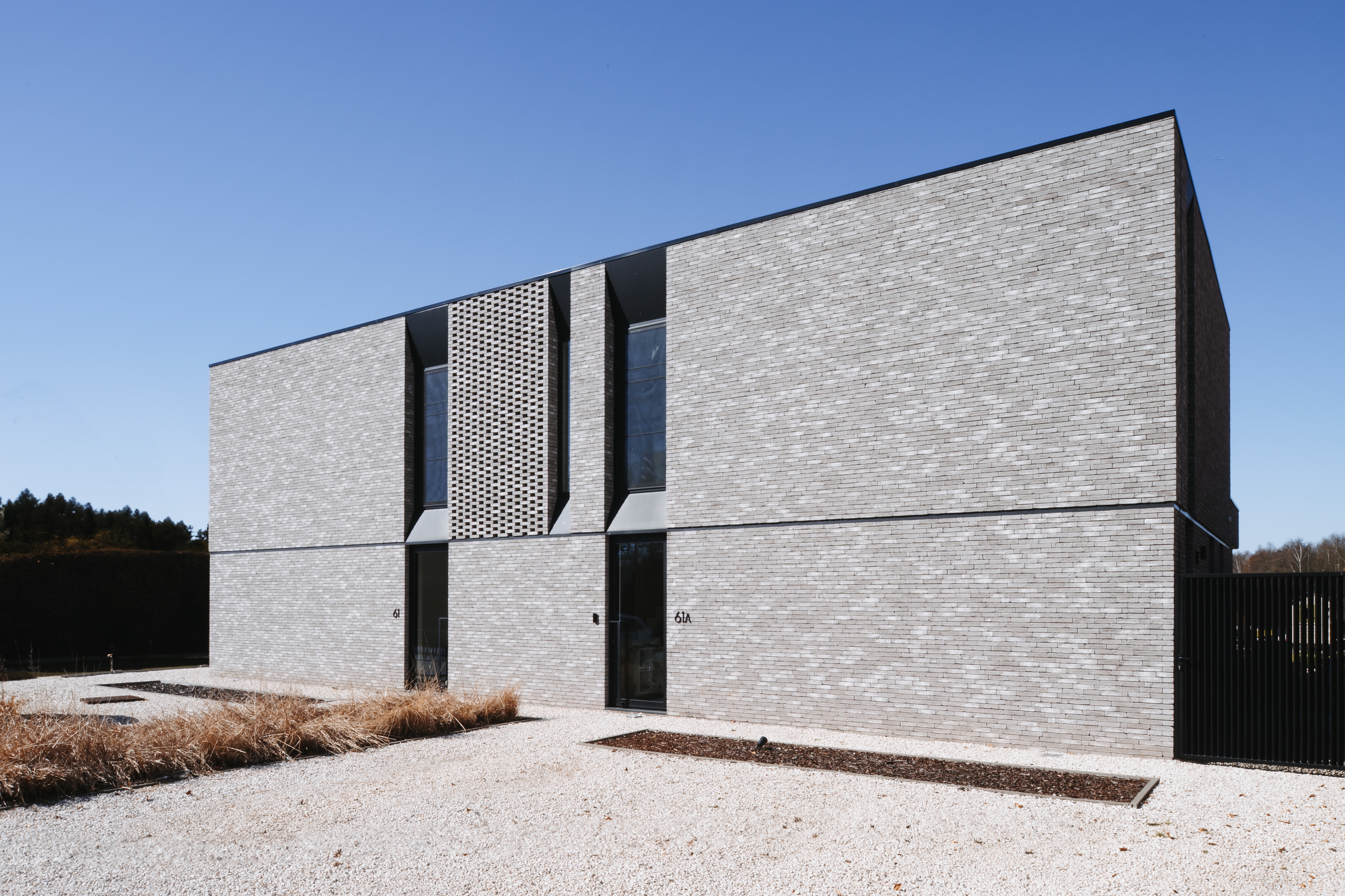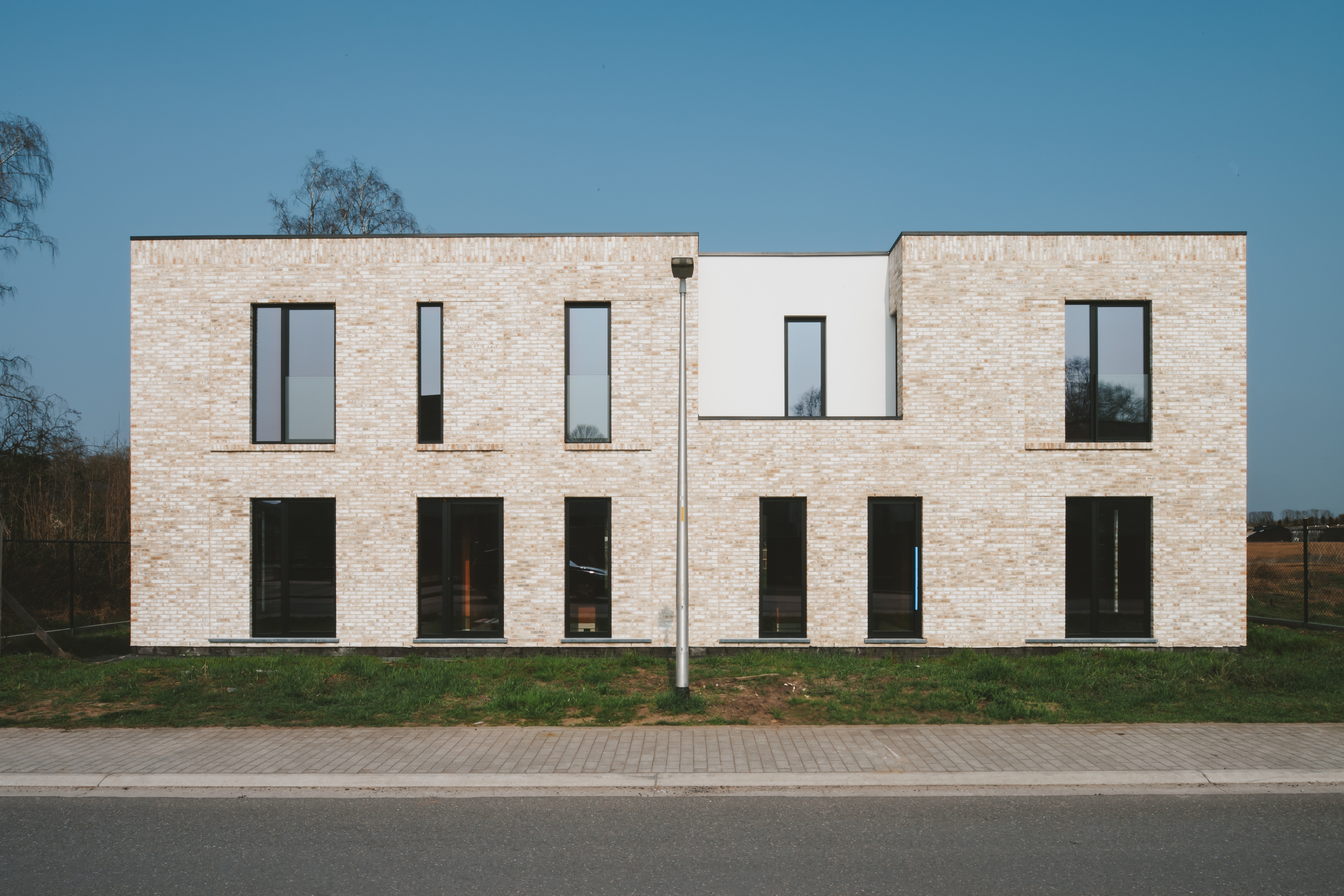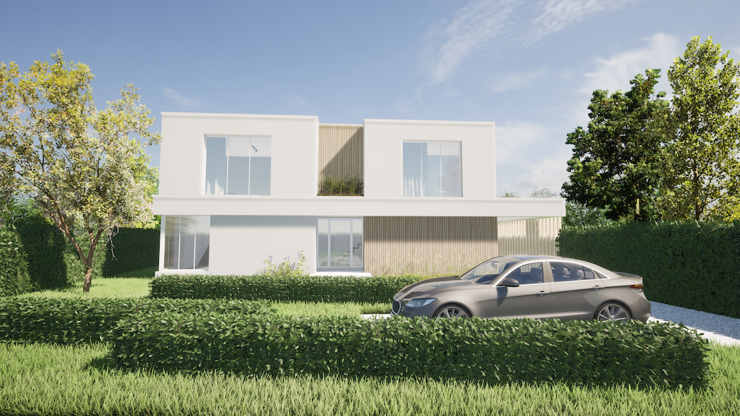 Twee moderne halfopen woningen die samen aanvoelen als één elegante villa. Voor een broer en zus die naast elkaar wilden wonen, met licht, zicht en samenhang in elke lijn.