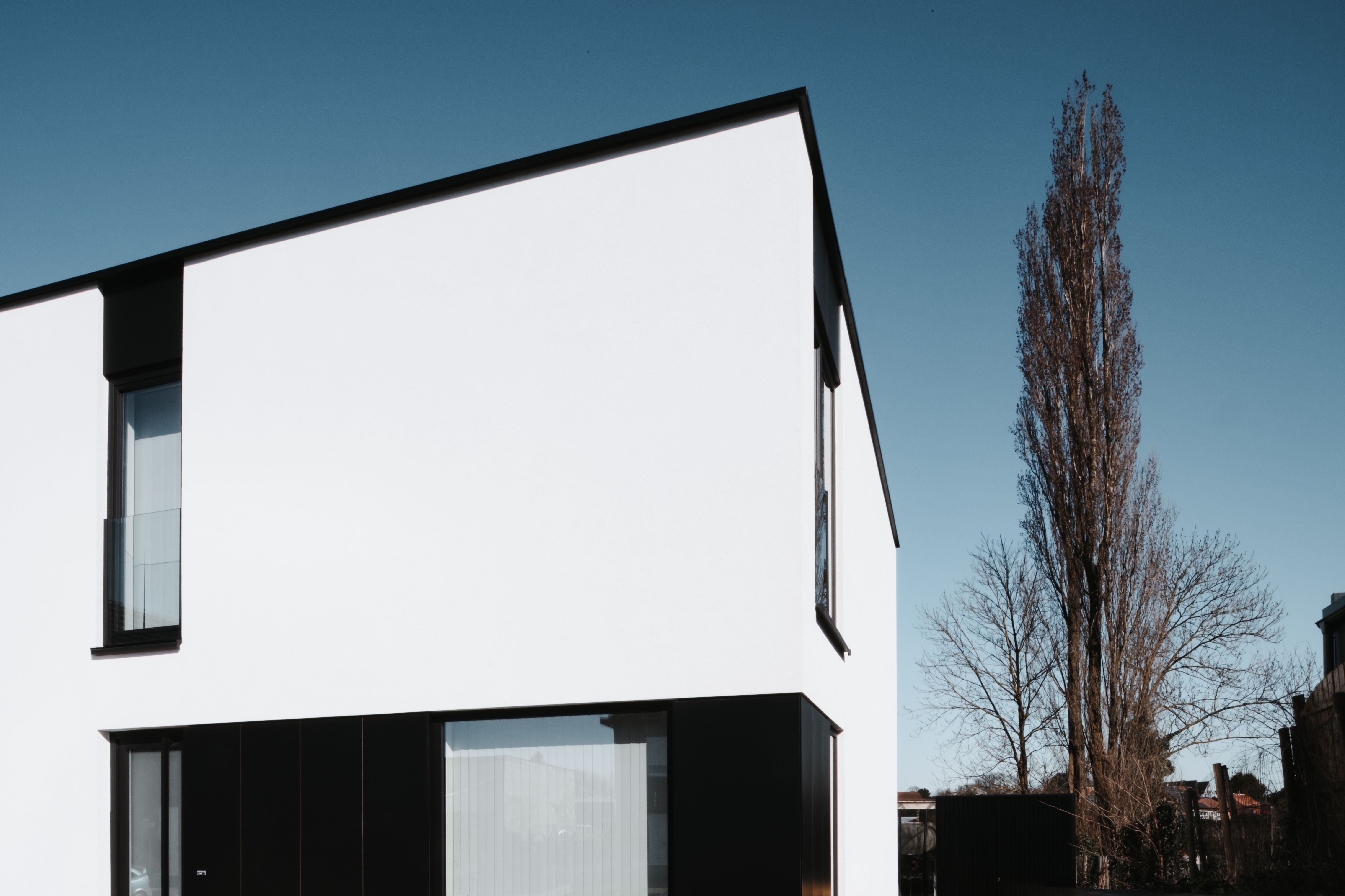Twee halfopen woningen, ontworpen als één samenhangend geheel. Strakke lijnen, speelse volumes en verfijnde details.