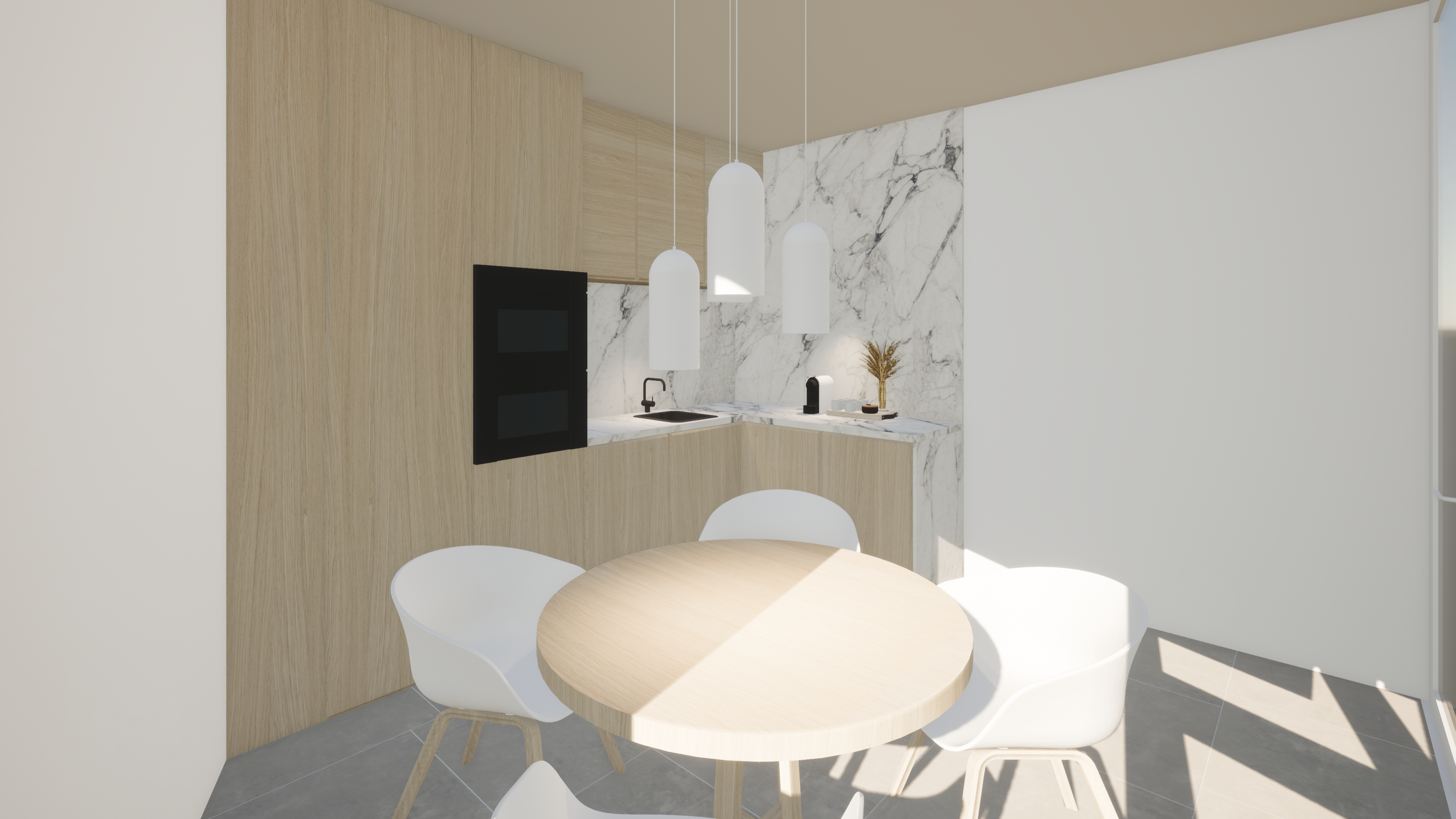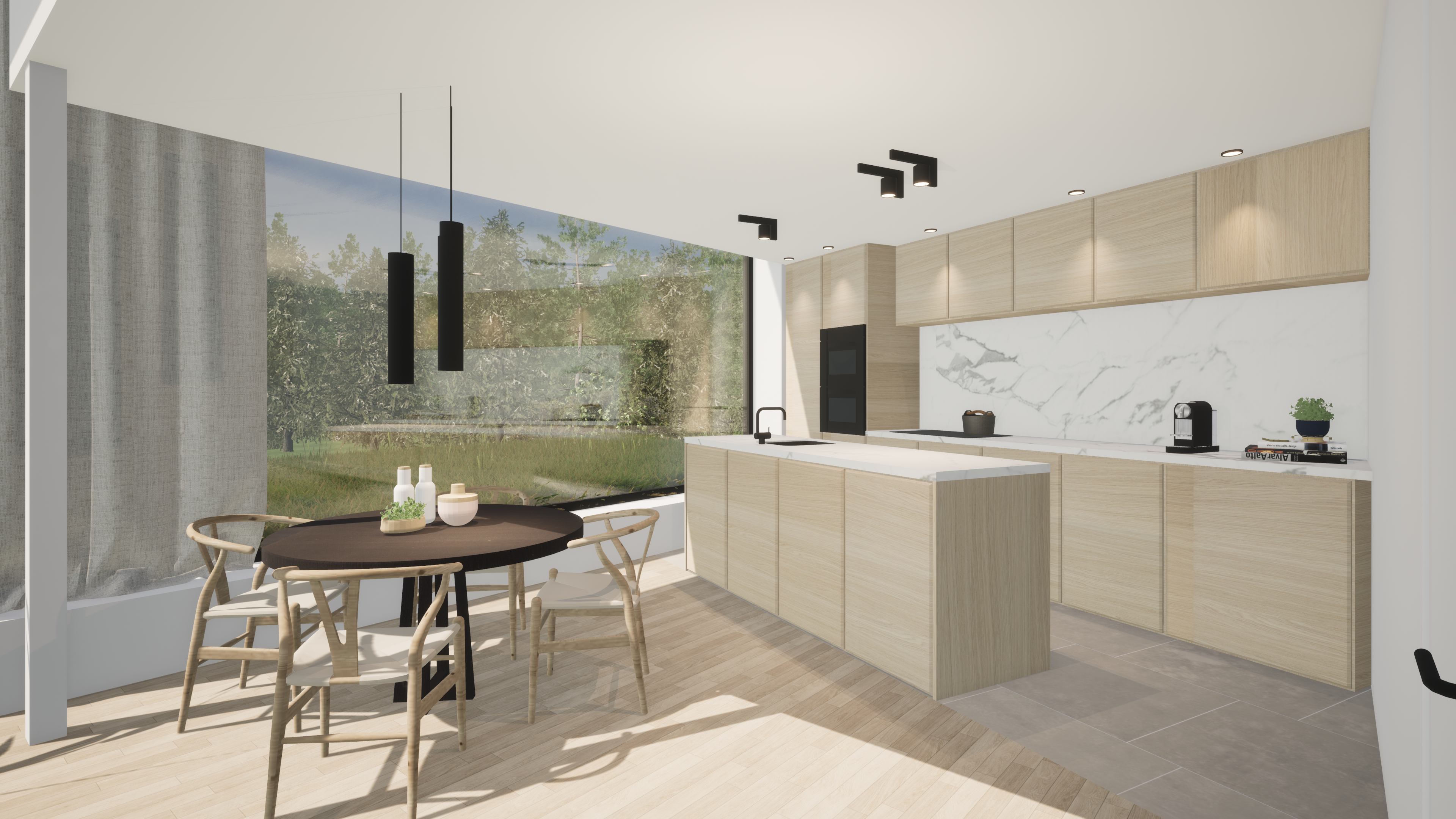 Boven het kantoor werd een volwaardig appartement geïntegreerd, met dakrandhoge ramen voor een maximale lichtinval en uitzicht. Ook hier werd aandacht besteed aan oriëntatie, woonkwaliteit en privacy.