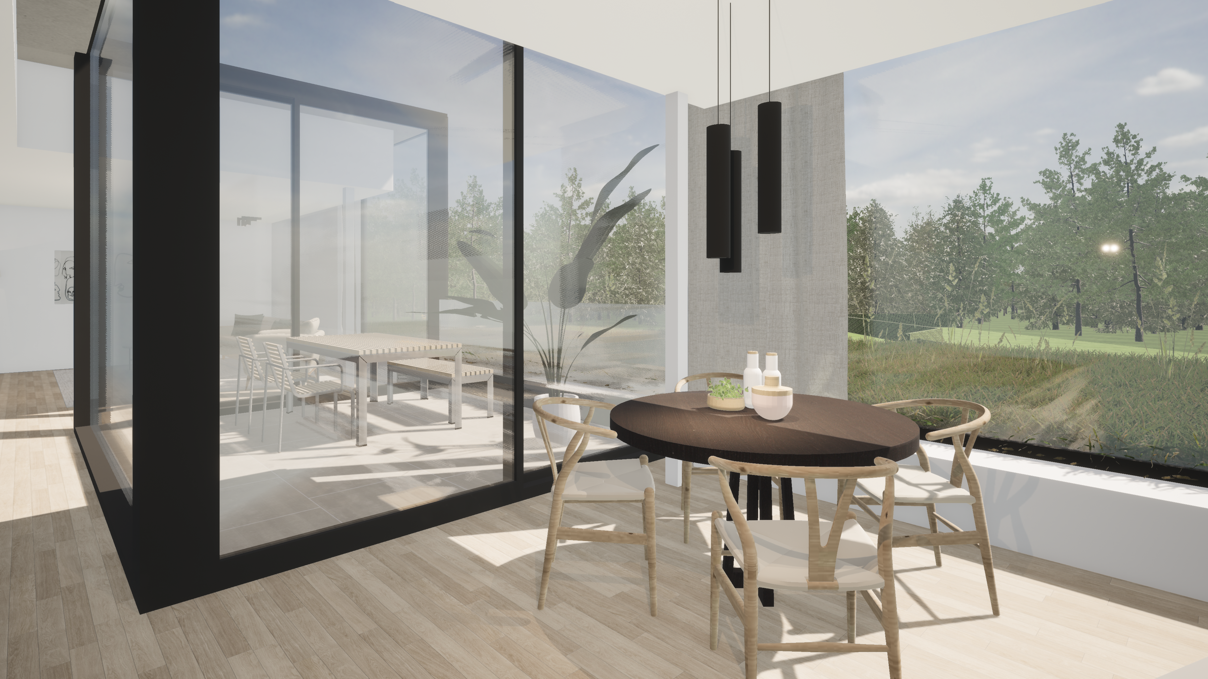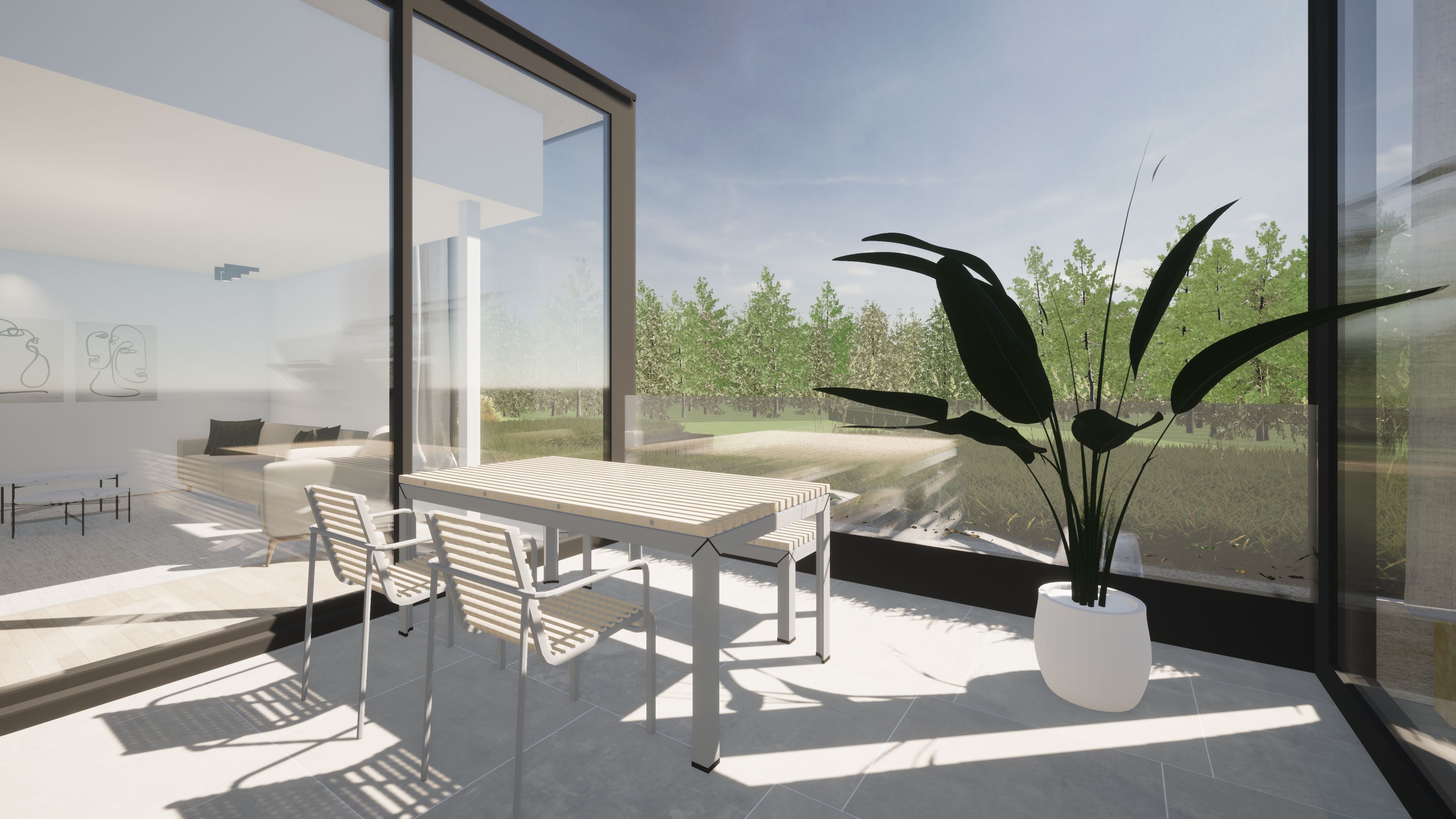 Binnenin primeert licht en transparantie. Dankzij een strategisch geplaatste patio krijgen alle werkplekken én de centrale gang zicht op groen. Deze binnentuin versterkt de rust en openheid die passen bij de functie van een Private House.