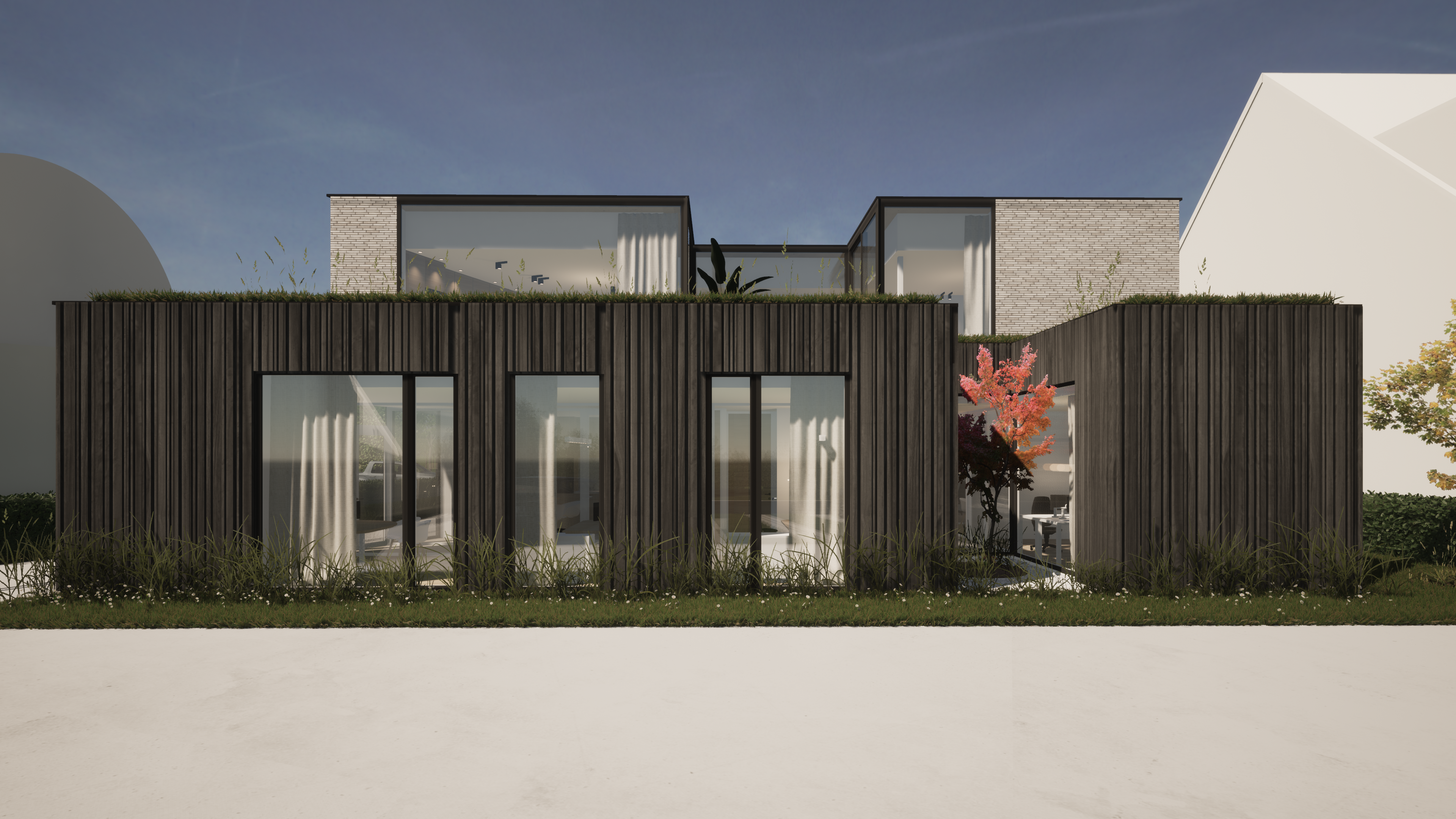 De nieuwbouw is afgestemd op het langgerekte perceel en volgt subtiel de schuine rooilijn. Dat levert niet alleen een speels gevelbeeld op, maar versterkt ook de relatie tussen het gebouw en zijn omgeving. Een luifel markeert de toegang tot het kantoor en biedt beschutting voor bezoekers.