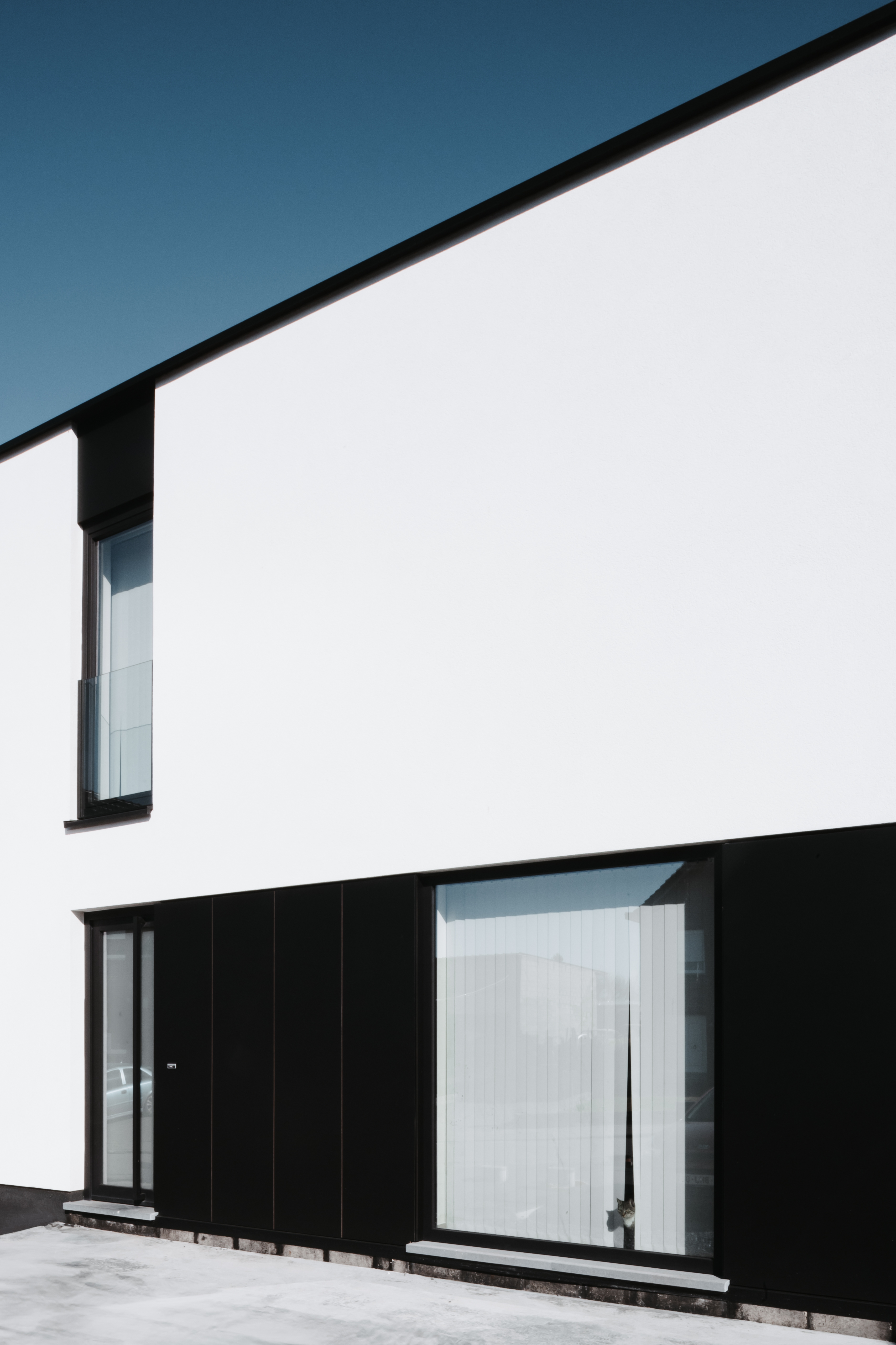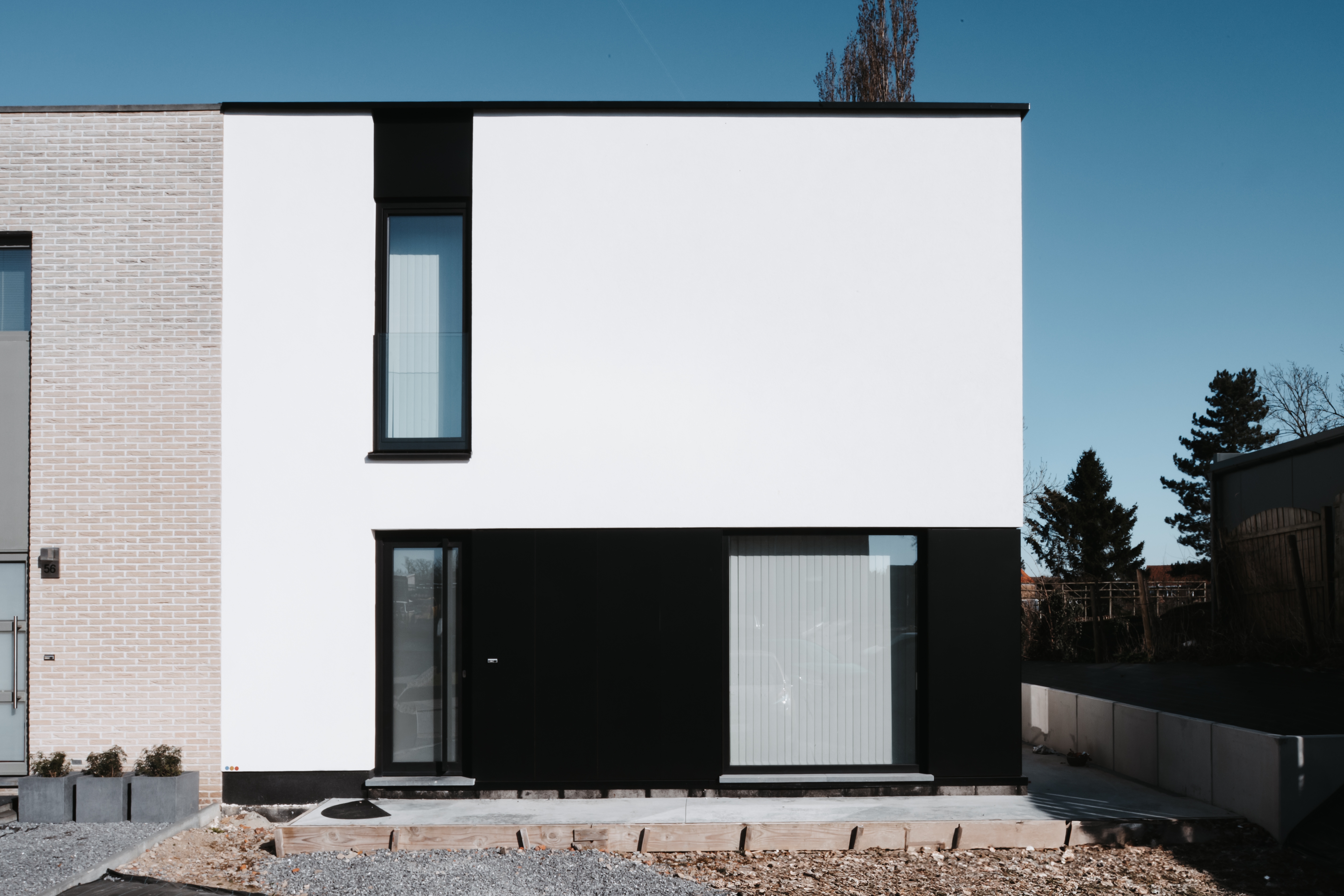 Deze woning is ontworpen in een hedendaagse stijl en uitgepuurde vormentaal. De gevel is opgebouwd uit wit pleisterwerk en contrasterende aluminium ramen in zwart, die zorgen voor ritme en verfijning. Het ontwerp blijft bewust compact en eenvoudig in opbouw, zonder in te boeten aan licht, ruimte of gebruiksgemak.