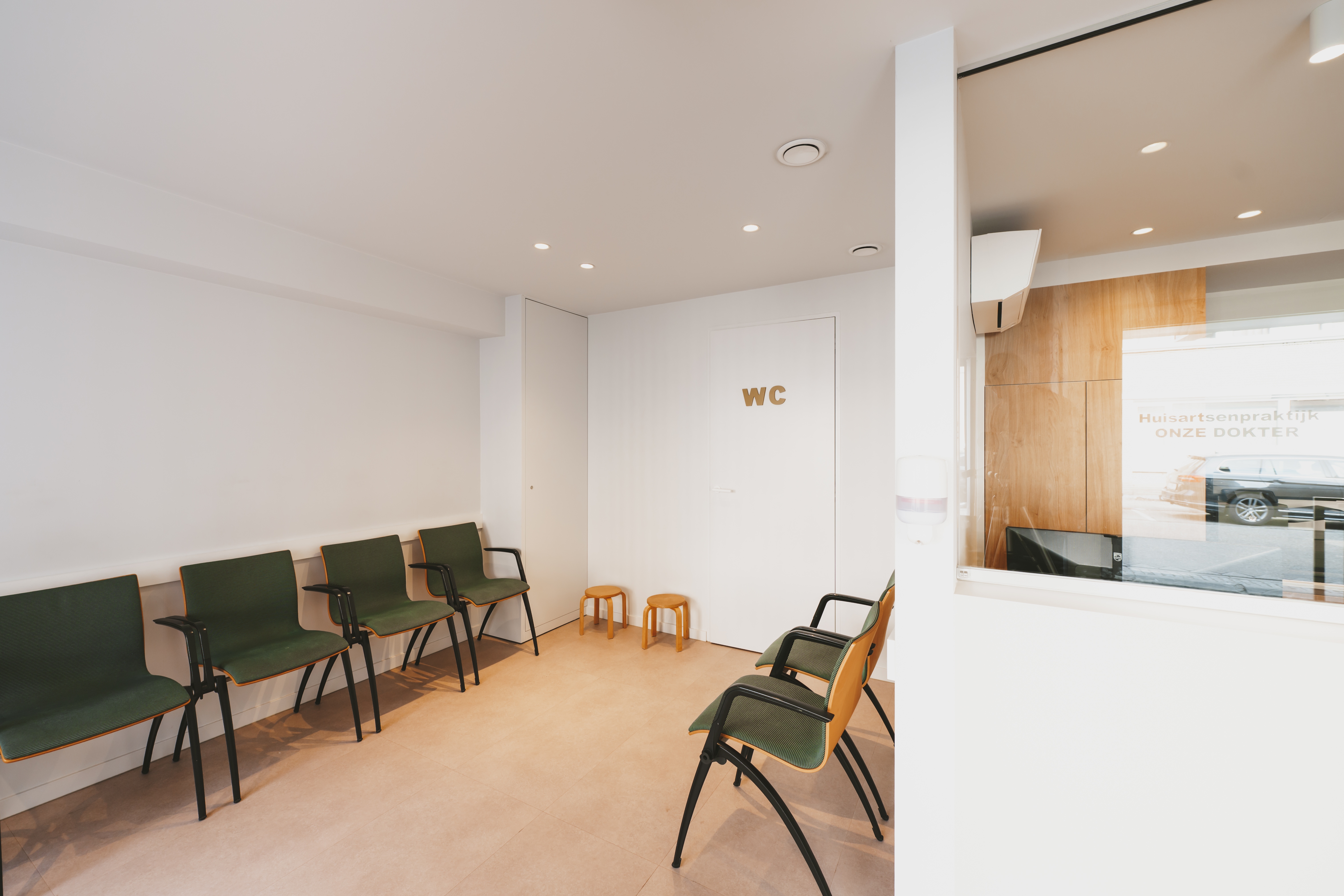 De oorspronkelijke praktijk met twee kabinetten werd volledig gestript en uitgebreid met een compacte aanbouw. Hierdoor konden we een nieuwe, heldere indeling realiseren waarin vier kabinetten langs een centrale circulatie-as liggen. Toegangscontrole aan de balie garandeert voldoende privacy en veiligheid voor arts en patiënt.