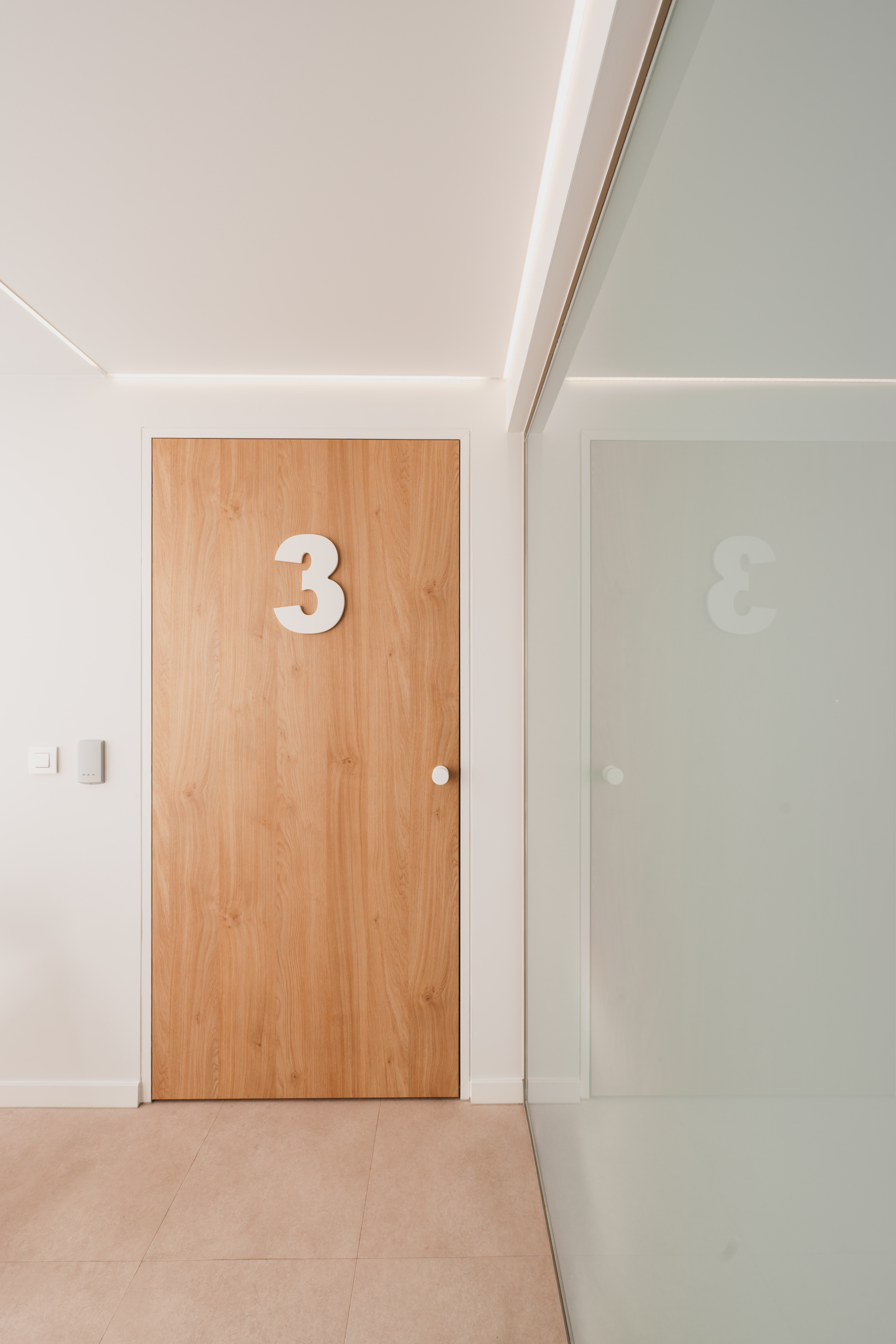 Ook esthetisch wordt de praktijk naar een hoger niveau getild. De voorgevel kreeg een nieuwe, verfijnde uitstraling met houten lamellen en geanodiseerd schrijnwerk. Binnen werd de balie herwerkt tot een functioneel en uitnodigend ontvangstpunt.