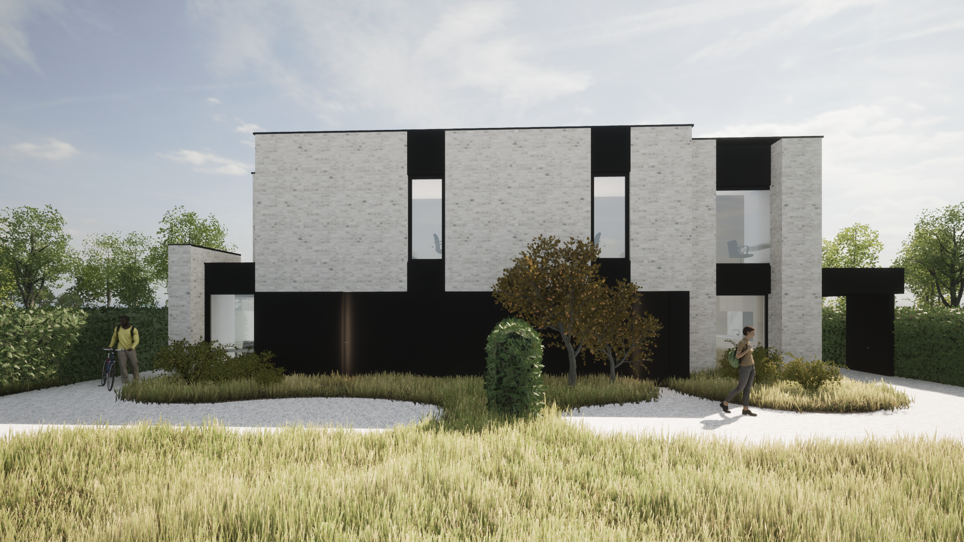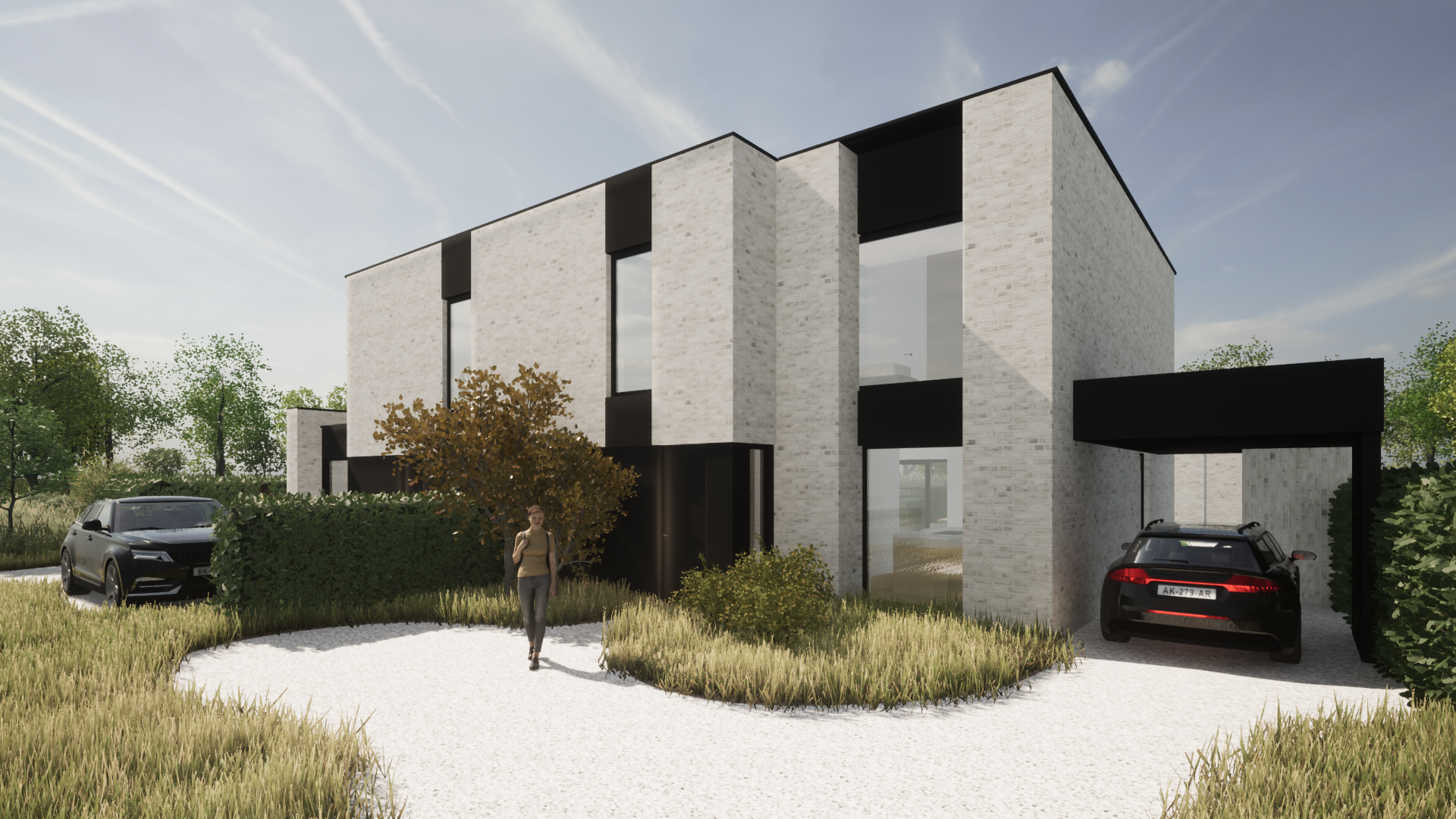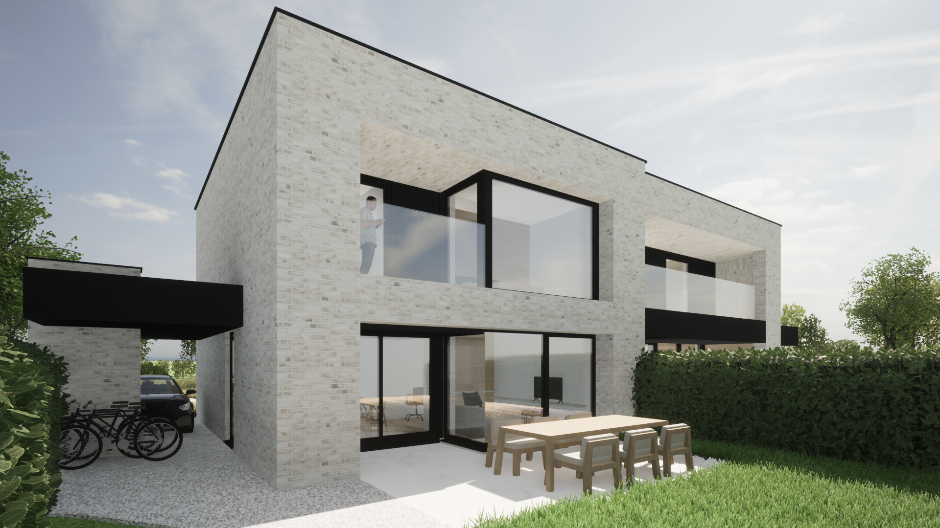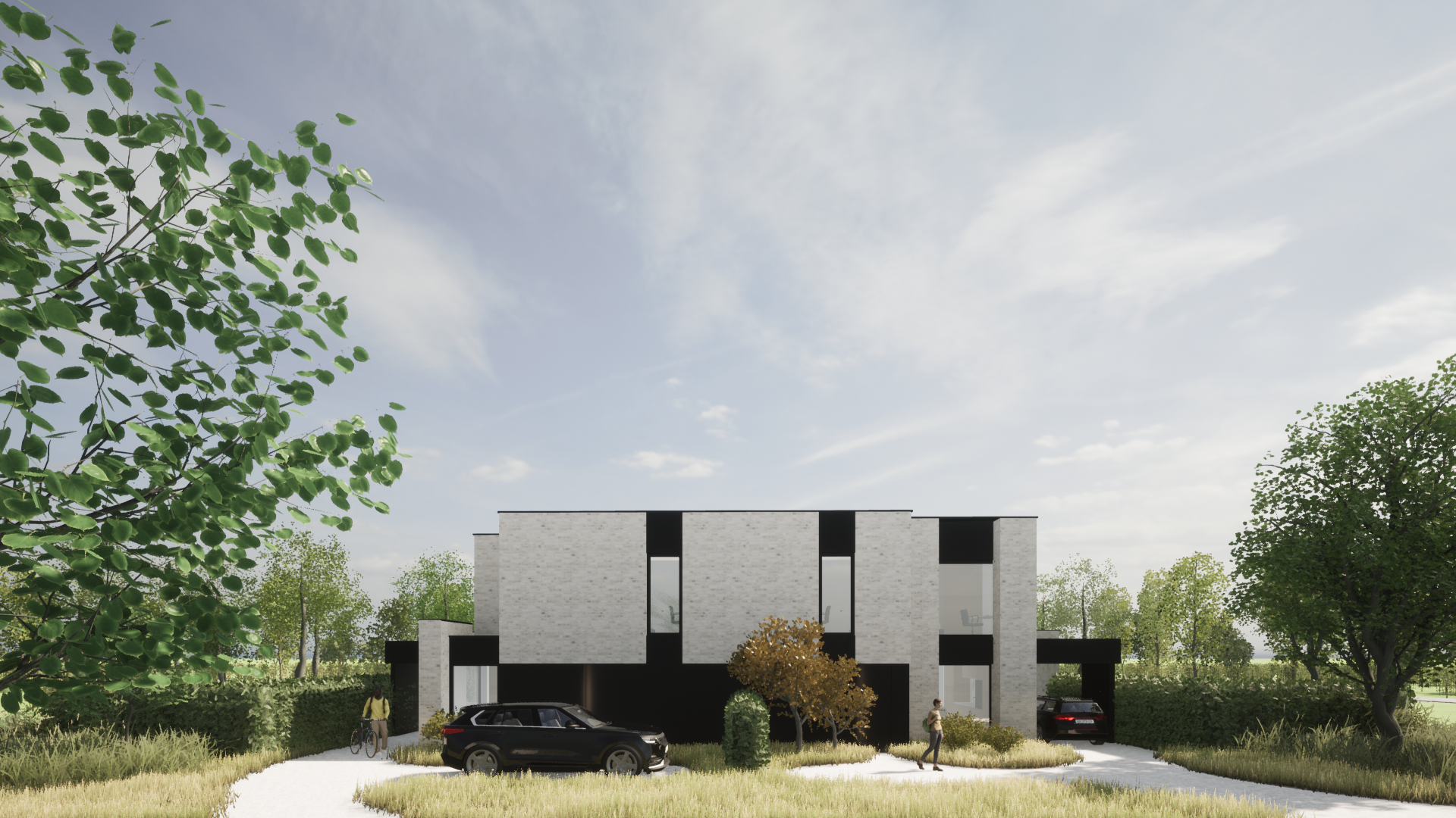 Voor een ontwikkelaar ontwierpen we twee halfopen gezinswoningen met een moderne signatuur. Door de dynamische volumewerking — met verspringingen, insnijdingen en overkragingen — vormen ze samen één krachtig architecturaal gebaar. Een genuanceerde grijze gevelsteen in combinatie met zwarte aluminium accenten en geïntegreerde carports zorgen voor een strak en warm geheel.