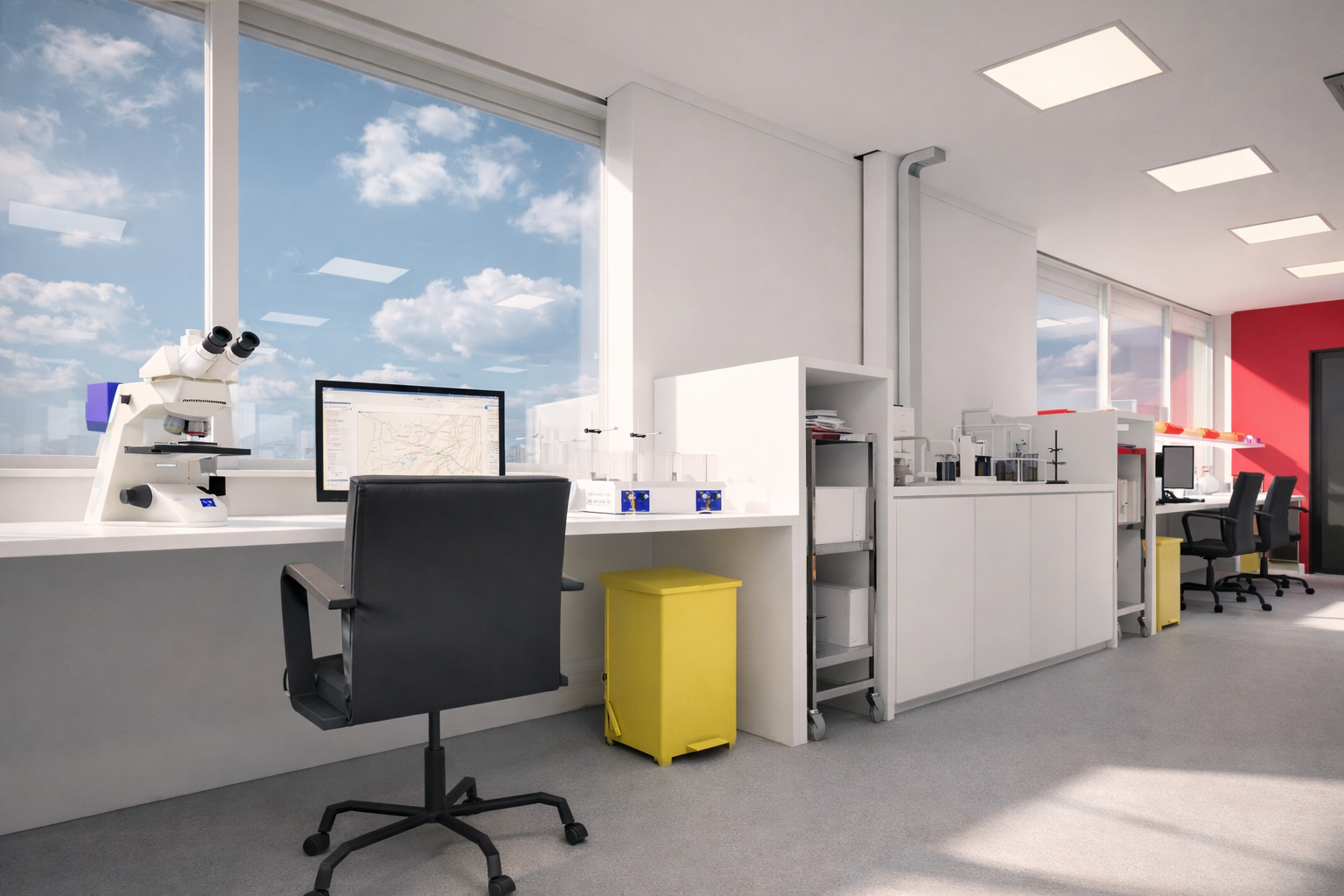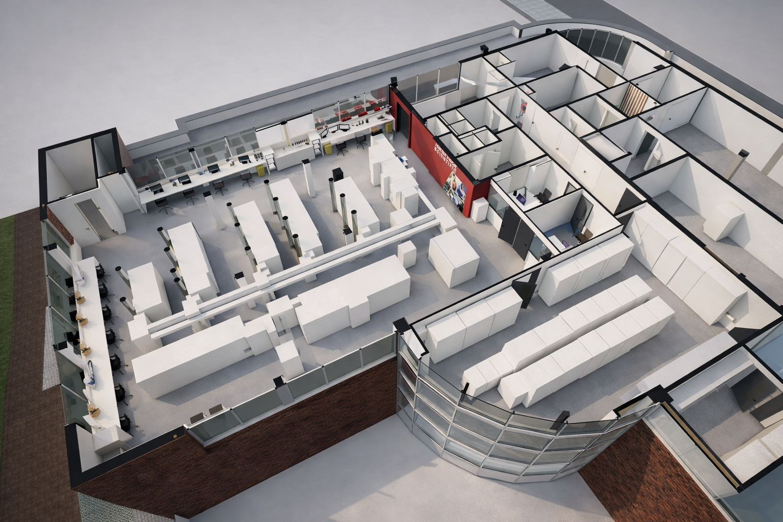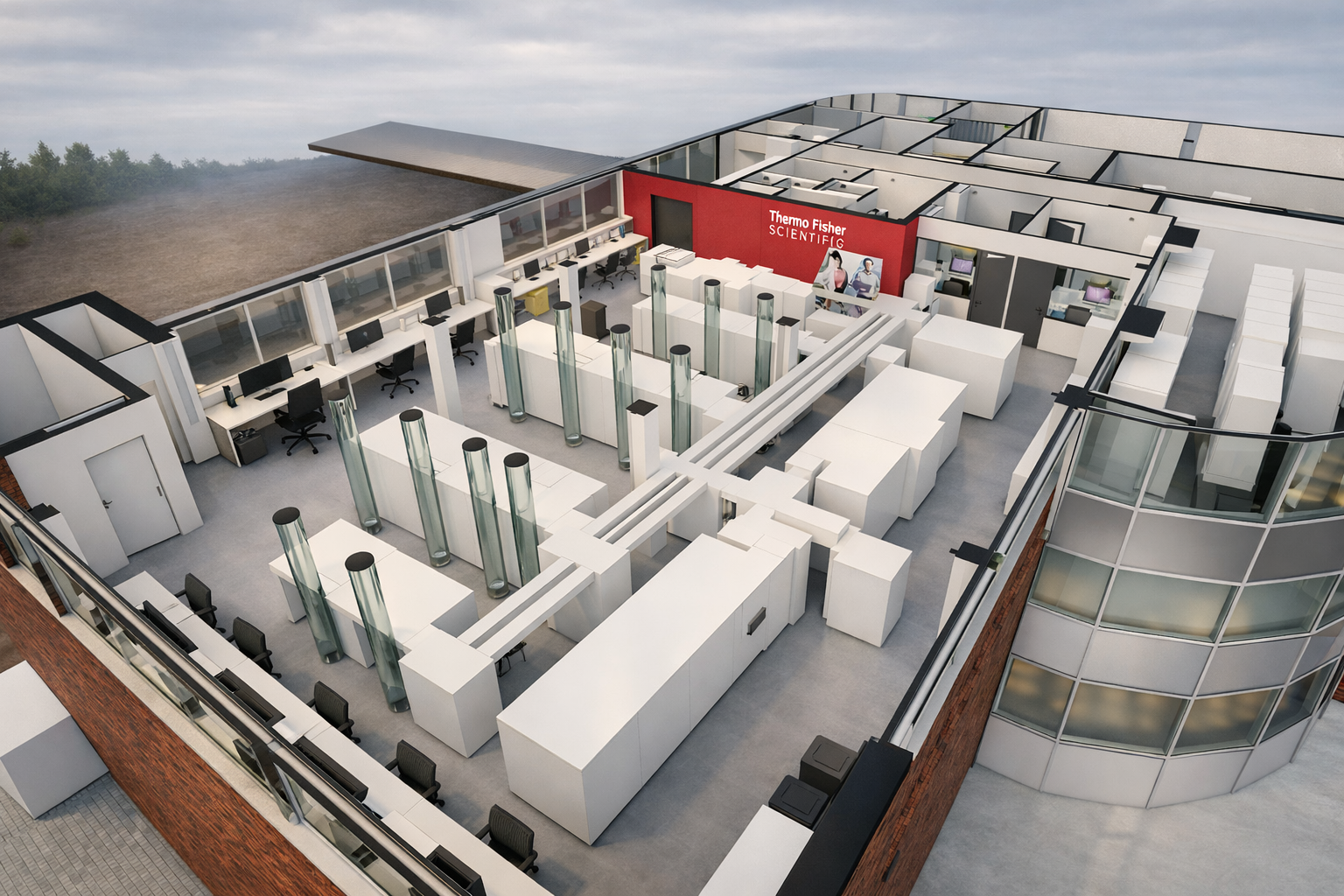 Voor Thermo Fisher Scientific hebben we één volledige verdieping gerenoveerd en deels uitgebreid voor de integratie van Cobas-lijnen binnen een sterk geautomatiseerd proces. De inrichting is afgestemd op een Frezer Farm-opstelling, waarbij automatisering centraal staat en het aantal werkplekken voor personeel bewust beperkt blijft. De ruimte ondersteunt maximale efficiëntie, continue werking en een logisch georganiseerde flow.