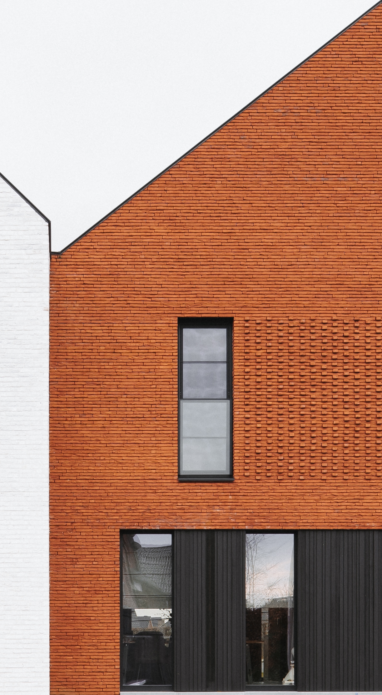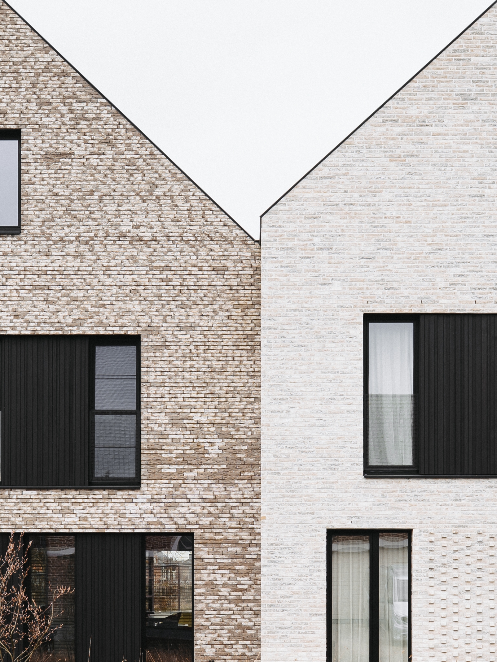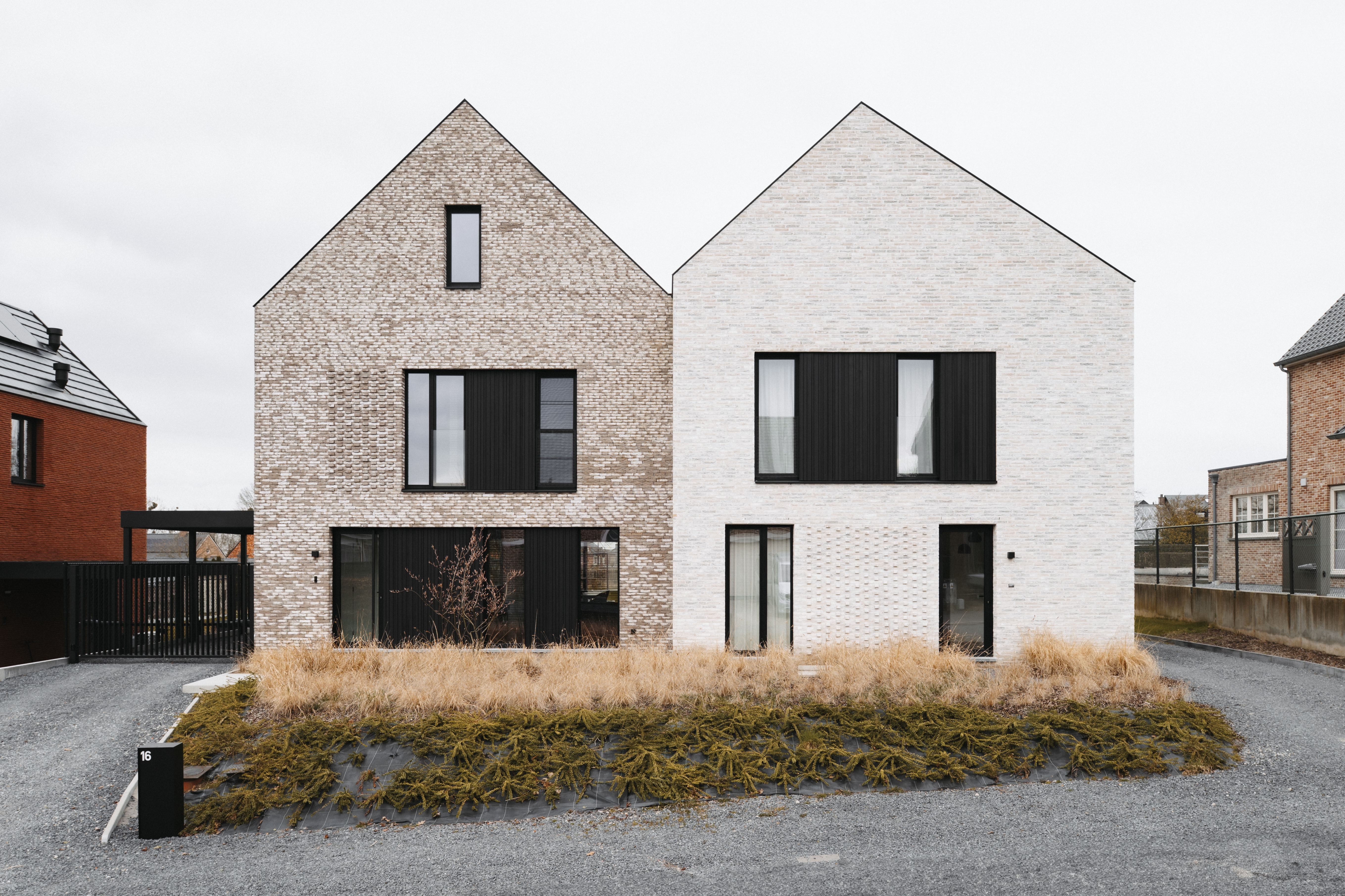 De gevels zijn opgebouwd uit wisselende gevelstenen, waarbij iedere vier woningen accenten krijgen door uitkragende stenen die het metselwerk breken en ritme aanbrengen. Geprofileerd zwart aluminium wordt toegepast als verfijning en moderne toets, wat de woningen een tijdloze en frisse uitstraling geeft.